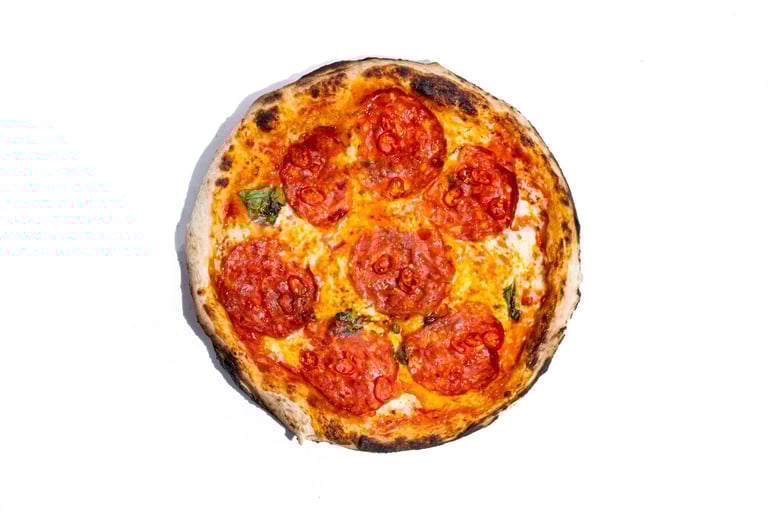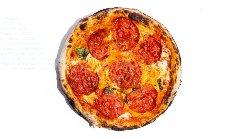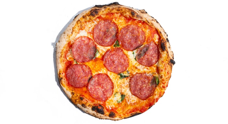 San marzano pomidorų padažas, pecorino romano sūris, šviežias bazilikas, fior di latte mocarela, pepperoni dešra, česnakinis sviestas, ypač tyras alyvuogių aliejus