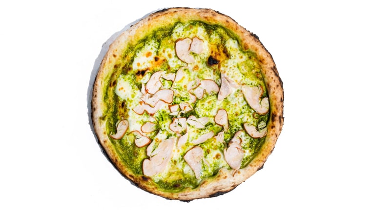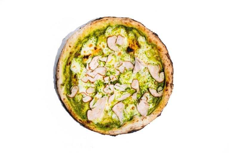 Bazilikų pesto, pecorino romano sūris, fior di latte mocarela, rūkyta vištienos file, medus, tyras alyvuogių aliejus