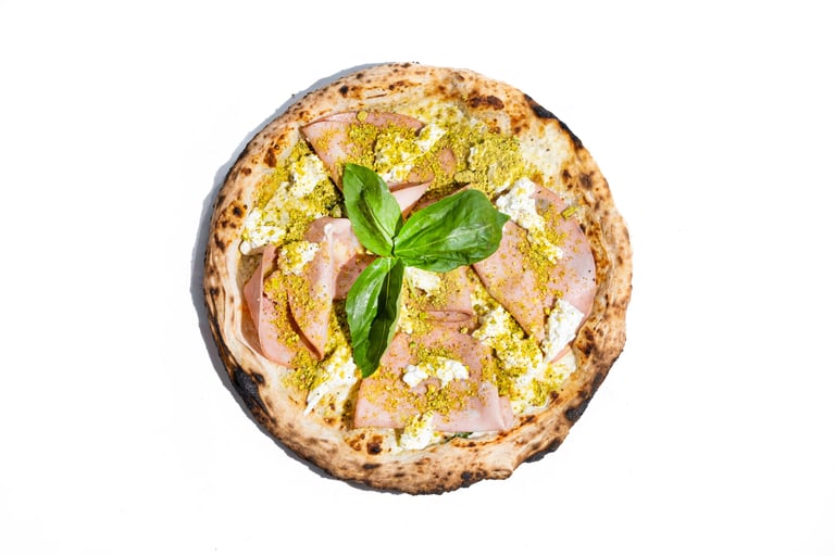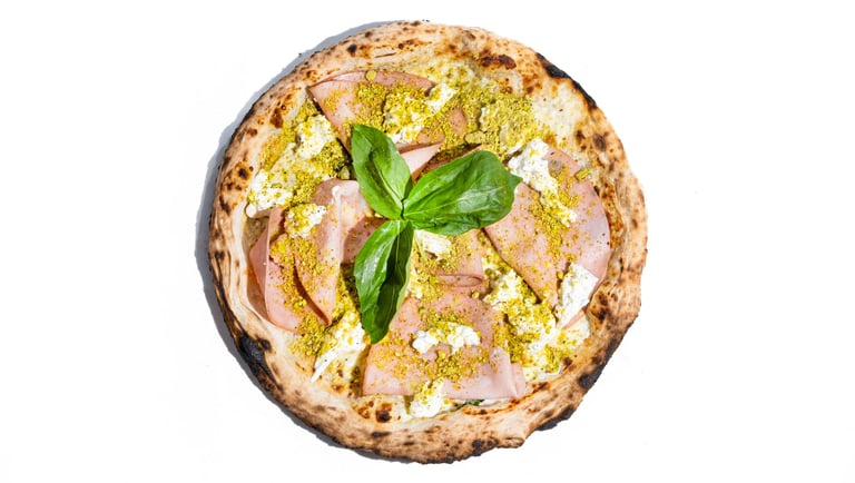 Rikotos padažas, pecorino romano sūris, fior di latte mocarela, mortadella dešra, traiškytos pistacijos, bazilikų pesto, stracciatella sūris, tyras alyvuogių aliejus, šviežias bazilikas