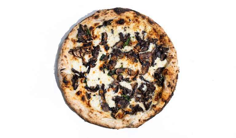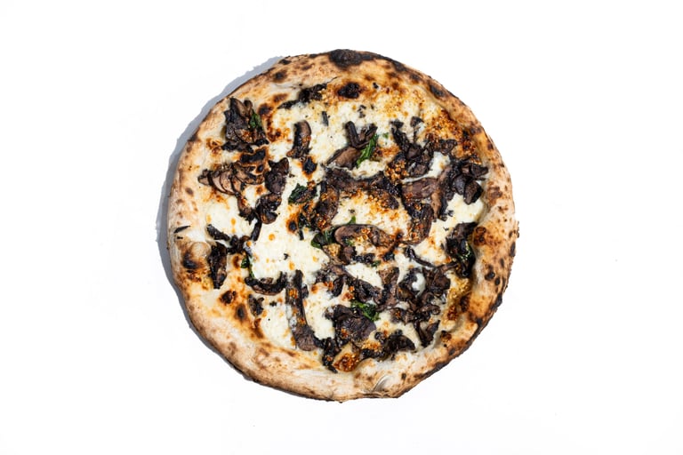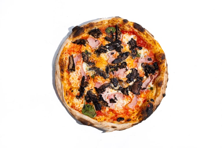 San marzano pomidorų padažas, pecorino romano sūris, šviežias bazilikas, fior di latte mocarela, virtas prosciutto kumpis, kepinti portobello grybai, tyras alyvuogių aliejus
