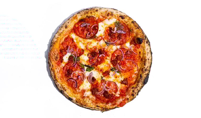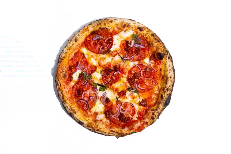 San marzano pomidorų padažas, pecorino romano sūris, šviežias bazilikas, fior di latte mocarela, raudonasis svogūnas, aštrus saliamis, aštri nduja dešra, šviežias čili pipiras, tyras alyvuogių aliejus