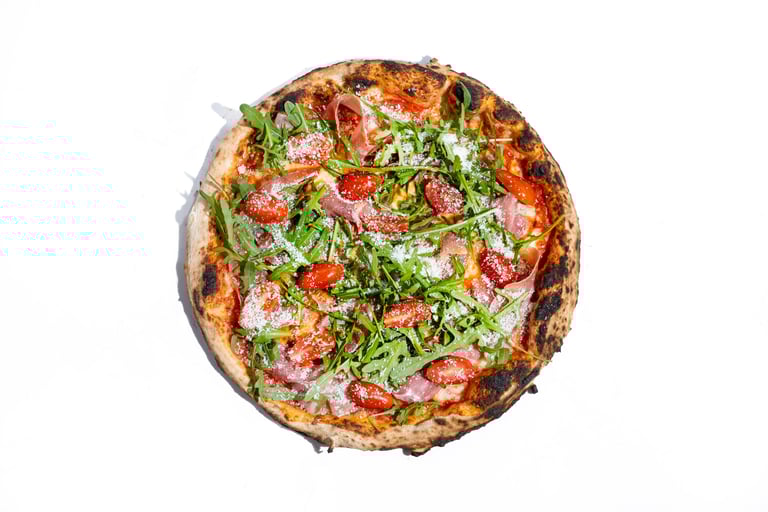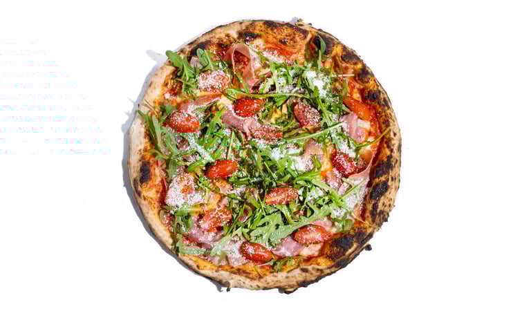 San marzano pomidorų padažas, šviežias bazilikas, fior di latte mocarela, vytintas prosciutto kumpis, gražgarstė, vyšniniai pomidoriukai, pecorino romano sūris, tyras alyvuogių aliejus
