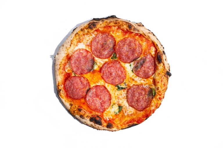 San marzano pomidorų padažas, pecorino romano sūris, šviežias bazilikas, fior di latte mocarela, itališkas saliamis, tyras alyvuogių aliejus